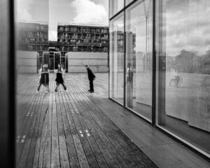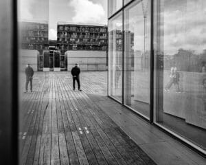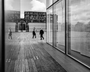 J’arrive à l’angle de l’une des tours Est, la T2, je vois les passants entre les vitres de ladite tour et le mur de métal, les deux recouverts de multiples reflets. Je me dis que l’endroit se prête à la photo. Je me poste. J’attends. Quelques passants mais rien qui ne commande l’oeil.